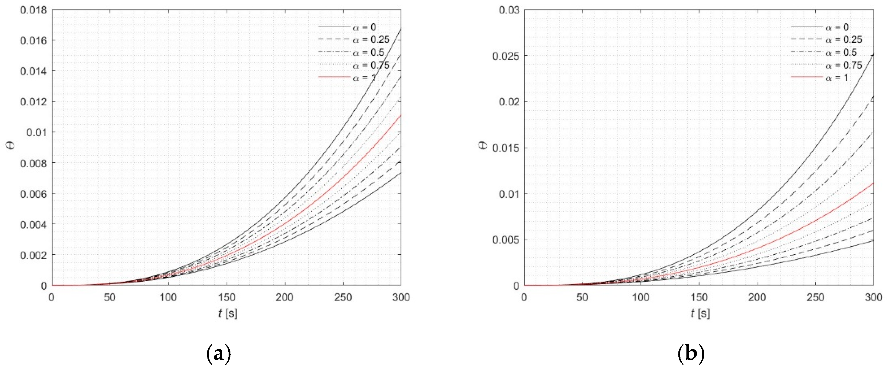 Figure 4). The selection of this parameter is crucial for the analysis and depends on the spread of various input parameters in the mathematical model. It is evident from the plot that the lines are not evenly spaced, which results from the strongly nonlinear nature of the analyzed phenomenon. For clarity of comparison, the results were plotted for the extreme values of the fuzzy numbers, i.e., for α = 0. A detailed comparison of interval widths for α = 0 is presented in