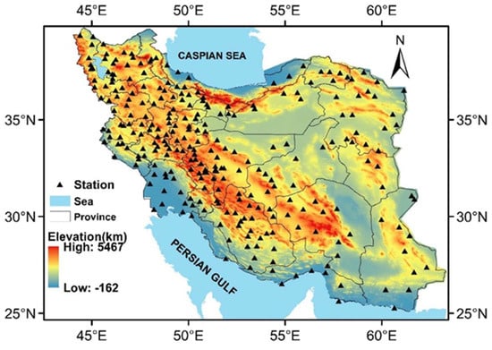 Iran (25° N–40° N, 44° E–63° E) is a country in the Middle East, with a total area of 1,648,195 , comprising 1% of Earth’s land mass. The Iranian landscape is characterized by a mountainous complex terrain with high mountains (highest point is Mount Damavand, at 5772 m), deep valleys (−28 m in the Caspian Sea coast), and extended deserts in the central and eastern plateaus, with an average height of 1200 m amsl (Figure 1). The country’s climate can be divided into four climatic zones: (i) a moderate and humid climate in the southern shores of the Caspian Sea, (ii) cold climate in mountains in the north and west of Iran, (iii) hot and dry climate in the central Iranian plateau, and (iv) hot and humid climate in the southern coast along the Persian Gulf and Oman Sea. The mean annual rainfall in Iran is about 260 mm, unevenly distributed across the country, from regions of high precipitation along the Caspian Sea to arid, dry landscapes (annual rainfall < 50 mm) in the southeast. Furthermore, the precipitation in the vast deserts such as Dasht-e Lut and Dasht-e Kavir is very low throughout the year. Due to its location in the dust belt, the whole country is highly affected by dust events originating from internal and external sources throughout the year [46,47,48,49,50]. Apart from the predominant dust [46,51,52,53,54,55,56], several petrochemical industries, power plants, and oil and gas refineries are major sources of anthropogenic aerosols and gaseous pollutants (NOx, SO2, CO) in Iranian megacities (i.e., Tehran, Mashhad, Isfahan, Tabriz, etc.) [57,58,59,60]. Consequently, air quality in major urban areas and industrial zones has significantly deteriorated, especially during the last few decades [4,61,62]. Furthermore, improper management of water resources (rivers, lakes, aquifers) and the effect of climate change has turned the lakes in the Iranian interior (i.e., Urmia, Jazmourian, Hamouns) into dried lake beds, with an important contribution to the increase in dust emissions [21,63,64].