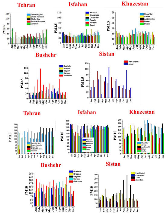 Average monthly concentrations of PM10 and PM2.5 at selected air monitoring stations in Tehran, Khuzestan, Isfahan, Bushehr, and Sistan Provinces in Iran during 2016–2021.