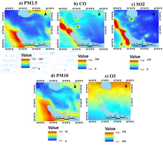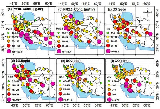 Figure 3 shows the average concentrations of PM10, PM2.5, O3, SO2, NO2, and CO at the examined stations all over Iran during 2016–2021, aiming at spatial mapping of air pollution across the country. Due to remote, arid, and sparsely populated landscapes of east Iran, most of the air pollution monitoring stations are located in the western part of the country and along the southern coastal areas.