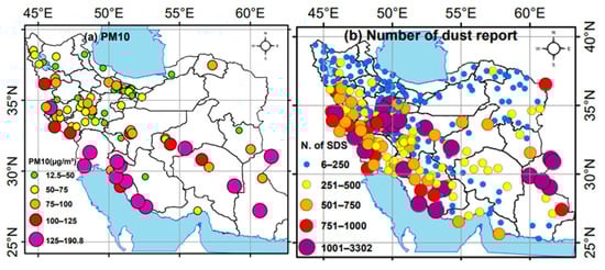 Figure 4 shows the annual mean concentrations of PM10 along with the number of dust events recorded in the weather stations across Iran from 2016 to 2021. Although there is an inconsistency in the number of weather stations (274) and PM10 measurements (86), the spatial distribution shows that there is a considerable agreement between PM10 and dust events across the country, suggesting that stations with the highest PM10 levels are frequently impacted by dust events of various intensities [30]. Dust events mostly occur along the northern coast of the Persian Gulf, in the western part of Iran, and in the Sistan Basin, east Iran. The highest number of dust events (3167 in 2016–2021) was reported in Dayyer port, located in the Persian Gulf coast, followed by Zabol in Sistan Basin, with 3020 dust reports; Arak, in the northern part of Iran (2777); and Zahak in the Sistan Basin (2683 dust reports). On the other hand, the highest annual mean PM10 measurements were in Zabol (190.8 µg m−3), Ahvaz (182.4 µg m−3), and Genaveh port, and along the northern coast of the Persian Gulf (170.8 µg m−3). However, the inconsistency in the number and spatial distribution between the weather–dust stations and PM10 stations does not allow a comprehensive and statistically robust correlation analysis between the two groups of data.