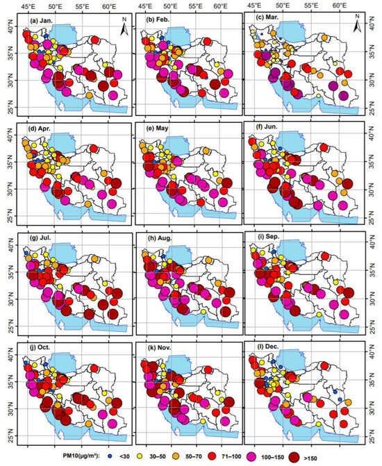 The monthly mean PM10 concentrations at the air monitoring stations across Iran during 2016–2021 are shown in Figure 5 and could be used as the basis for the seasonality of particulate pollution in the Middle East. On a monthly and seasonal basis, higher PM10 concentrations were observed in the southwest part of Iran that is usually affected by dust storms raised from desert areas in Syria and Iraq [47]. Furthermore, high PM10 concentrations were observed in the northern shores of the Persian Gulf, in the Sistan Basin and in stations in the central Iranian Plateau, affected by local, regional, and distant dust sources. Significantly lower PM10 levels could be seen at stations in NW Iran from December to April, while the dust-prone stations exhibited larger PM10 concentrations during the summer months due to increased dust activity. In general, there is a rather weak seasonality in PM10 concentrations across the country, since high PM10 levels can be seen throughout the year at several stations due to multiple anthropogenic and natural sources. Khorshiddoust et al. [91] investigated PM10 concentrations in Tabriz metropolitan area from 2005 to 2012, revealing summer maximum and winter minimum levels in all the examined stations.