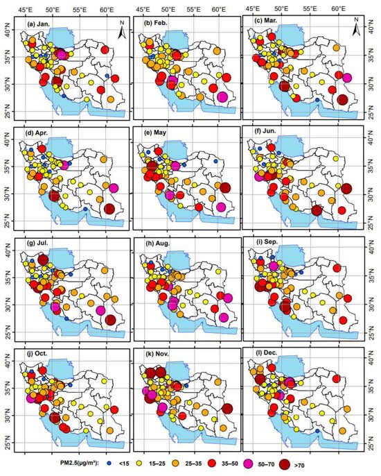 Figure 6 shows the spatial distribution of the monthly mean PM2.5 concentrations in 2016–2021. The highest amounts of PM2.5 are mostly seen over megacities like Tehran due to vehicular exhausts, the burning of fossil fuels, and other anthropogenic activities, as well as industrialized cities and sites majorly affected by dust storms (like Zabol). A main finding is the uneven seasonality of PM2.5 between the examined stations, since in areas prone to dust storms in eastern Iran, higher PM2.5 levels are seen during the warm period of the year, while in Tehran, PM2.5 levels are higher during the cold season. This is attributed to enhanced emissions for domestic heating, cold and stagnant weather conditions, and the frequent inversions related to the Tehran’s topography [92,93,94]. Another station that is highlighted for its high monthly PM2.5 levels is Ganaveh port, in the northern coast of the Persian Gulf, especially in the warm season, when the enhanced pollution levels are attributed to increased shipping emissions and port activities. Furthermore, enhanced monthly PM2.5 is shown in the western stations from May to November, as well as in eastern stations from March to August, related to maximized dust activity in these areas.