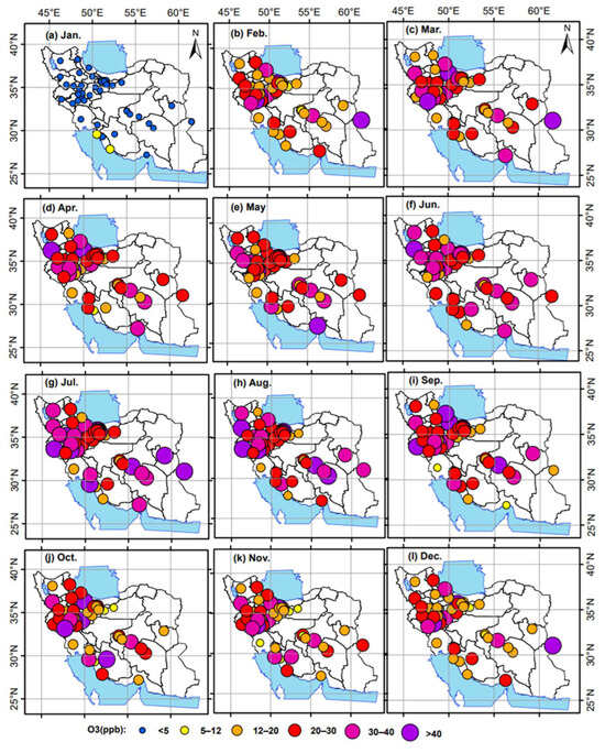 Figure 7 shows the monthly O3 concentrations across the stations, with a spatial distribution of this pollutant over the whole Iranian territory. As expected, maximum surface ozone concentrations are shown in the warm months due to chemical reactions between NOx and solar radiation [95,96,97]. Therefore, O3 pollution increases significantly from March to September, with most stations presenting a decreasing trend after October. Although the number of stations with availability of O3 measurements is lower (56) than other air pollutants, the spatiotemporal distribution across the country is quite notable. The surface O3 levels in Zabol are high in certain months, exhibiting an uneven seasonality that may be related to the activities of cement and concrete factories near the city. As expected, O3 concentrations are high in the whole Tehran Province due to high population (~14 million) and enhanced NOx and VOCs (volatile organic compounds) emissions from many vehicles and industries [98,99]. Furthermore, high levels of O3 pollution are seen in Bandar Abbas, a major port in the Persian Gulf, from March to July. This port is especially important for the Iranian economy in terms of commercial shipping and logistics, thus resulting in high pollution emissions throughout the year. The highest monthly mean O3 concentration was shown in July (55.3 ppb) and August (49.6 ppb) in Khoram Abad (Lorestan Province in west Iran), attributed to increased industrial emissions and the specific topography, with valley-like characteristics that allow the accumulation of pollutants and high O3 formation during summer.