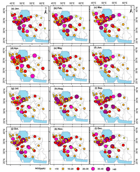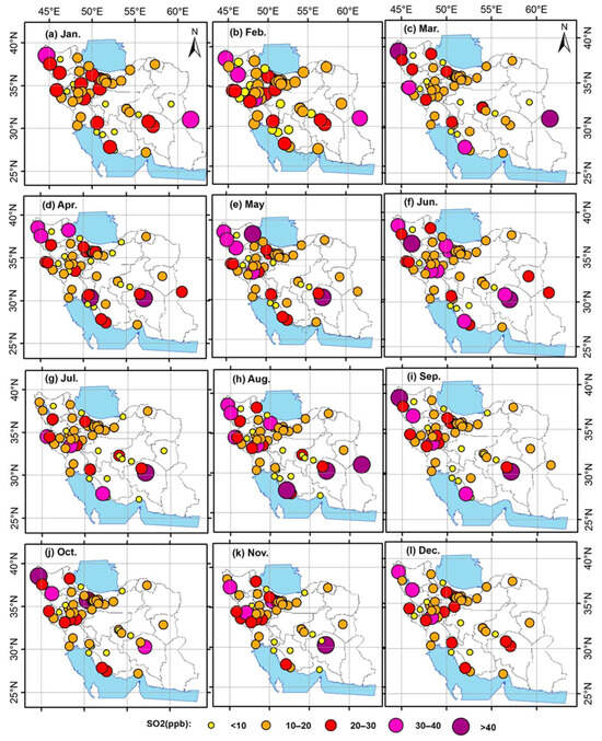 Figure 9 shows the monthly mean concentrations of SO2 at 60 stations across the Iranian territory. The spatial distribution and levels show that Iranian cities are mostly impacted by PM10, PM2.5, O3, and NO2 rather than SO2 pollution. In general, there is an uneven spatial distribution of SO2 across Iran, also associated with a station-dependent seasonality.
