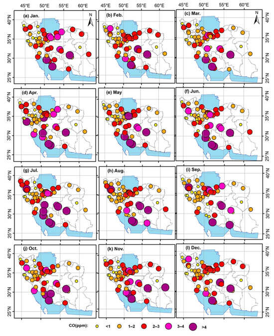 Figure 10 shows the spatial distribution of the monthly mean CO concentrations in 2016–2021. High levels of CO are mostly produced in areas with heavy traffic, industrial activity, and combustion emissions. CO levels reach a maximum at stations along the Persian Gulf coast, as well as in Tehran, Kerman, and Yazd. Furthermore, there is no distinct seasonality, with these stations exhibiting high CO levels throughout the year [111,112]. Ship emissions are responsible for the high CO levels in the coastal stations, while the industrial zones near to Kerman and Yazd contribute to enhanced CO pollution in these cities. Domestic heating during winter, due to harsh weather conditions, is a major factor of CO pollution in Tehran, along with vehicular emissions and industrial activity [113]. Yazd is one of the largest centers of heavy industries in Iran. The city was ranked first in Iran in the production of steel, tiles, and textile products, causing the deterioration of the atmospheric environment, with high CO emissions throughout the year.