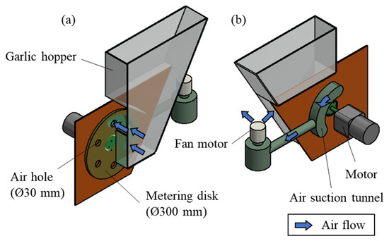 The air-suction soft-metering device consists of a garlic hopper to hold garlic cloves, a metering disk that rotates inside the hopper and picks up garlic cloves, a motor to rotate the metering disk, air holes for inserting a soft suction hole that facilitate garlic clove pick-up, a fan motor to generate the air-suction effect, and an air-suction tunnel connecting the air holes and fan motor. The diameter of the metering disk was 300 mm, and six air holes were provided at 60° intervals. The configurations of the device at the front and back are shown in Figure 1a and Figure 1b, respectively.