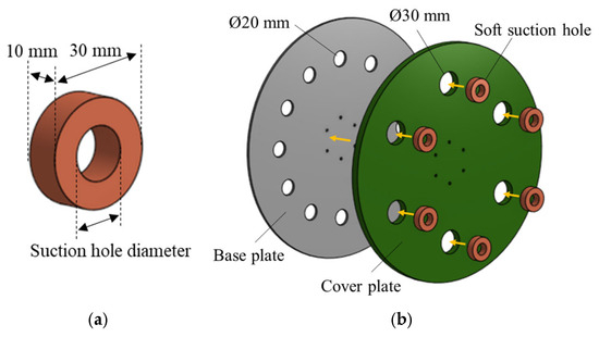 The suction hole hardness was set to three levels, soft, moderately soft, and relatively firm, and fabricated accordingly. The hardness of the three suction holes was measured as 1.4 HA, 16.7 HA, and 27.2 HA, respectively, based on Shore A hardness, according to ASTM D2240 [23] (SHORE 10A, TMTeck, China).