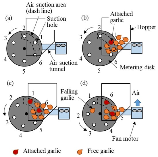 Operation process of the air-suction soft-metering device. (a) Suction area entry; (b) garlic attachment; (c) second garlic attachment; (d) garlic release. The numbers indicate the displacement of the suction hole.