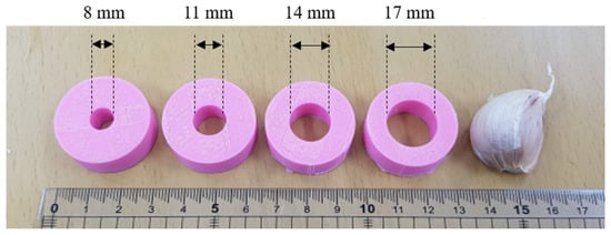 Two design elements were selected for the soft-metering device: diameter of the soft suction hole and hardness of the soft suction hole. The suction hole diameter was set to four levels, 8 mm, 11 mm, 14 mm, and 17 mm, depending on the size of the garlic, and these were fabricated (Figure 5). The size of garlic cultivated in Korea was investigated to be 25–49 mm in length, 10–24 mm in width, and 12–27 mm in thickness [22]. The smallest hole size, 8 mm, is the condition to prevent any gaps between the hole and the garlic, and the largest hole size, 17 mm, is the maximum size to prevent most garlic from passing through the hole. To eliminate the effect of garlic size on the metering performance, garlic cloves of similar sizes were selected. The size of garlic that passes through a 19 mm standard sieve but is filtered out by a 16 mm standard sieve was selected for the experiment, which is approximately the medium size of cultivated garlic.