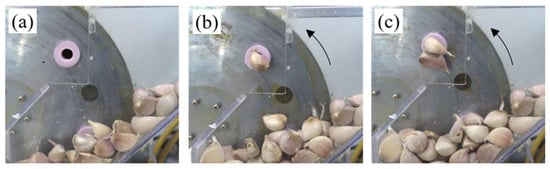 Garlic is a spice vegetable cultivated worldwide because it is one of the most common cooking ingredients, with global production estimated to reach 28.7 million tons in 2023. The largest garlic producers recently reported are China and India, expected to produce 20.7 million tons and 3.3 million tons, respectively, in 2023, accounting for approximately 72% and 11% of global production [1]. Despite this, garlic cultivation still relies heavily on human labor rather than mechanization. In particular, the mechanization rate for garlic cultivation in Korea remains low, at 14.8% in 2023 [2]. Mechanization of most plant cultivars, including garlic, involves soil tillage, planting, fertilizer application, pesticide application, and harvesting. For planting, which involves inserting the seeds into the ground and covering them with soil, mechanization is difficult due to the shape of the garlic clove. The development of a planter requires securing technologies such as clove metering, planting spacing, and depth control [3]. Clove metering refers to picking up a clove of garlic from a hopper filled with a large quantity of garlic. Precise clove metering is especially difficult in garlic planting, where multiple or missed metering events commonly occur [4]. Autonomous or unmanned agricultural machines have been introduced in recent years [5,6,7,8], and this technological trend requires work units with precise performance and electronic control capabilities. This study aims to enable the application of clove metering technology to autonomous or unmanned agricultural machines.