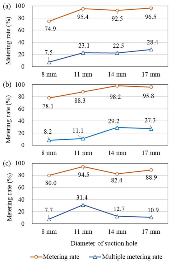 Metering rate and multiple-metering rate as a function of suction hole diameter for different material hardness levels: (a) 1.4 HA, (b) 16.7 HA, and (c) 27.2 HA.