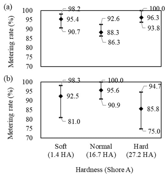 The change in the metering rate depending on the hardness of the suction hole material was analyzed for the 11 mm and 14 mm diameters, where the highest metering rate was observed in Figure 8. When the suction hole diameter was 11 mm, high metering rates were observed at hardness levels of 1.4 HA and 27.2 HA. By contrast, when the diameter of the suction hole was 14 mm, a high metering rate was observed for a hardness of 16.7 HA. At the average metering rate, a distinct relationship between the material hardness and suction hole diameter was not apparent. However, the distribution of the metering rate increased with the suction hole diameter. When the suction hole hardness was 16.7 HA, the difference between the maximum and minimum metering rate values increased from 6.3% to 9.1% when the diameter increased from 11 mm to 14 mm. However, when the hardness of the suction hole was 1.4 HA and 27.2 HA, the difference increased significantly from 7.5% to 17.3% and from 6.2% to 19.7%, respectively. These results are attributed to the air-suction volume per unit area for picking up garlic decreasing as the diameter of the suction hole increased. Furthermore, even when the garlic adheres to the suction hole, the empty space between the garlic and suction hole may not form an optimal seal and reduce the suction force, thereby diminishing the effectiveness of adhesion and subsequent detachment.