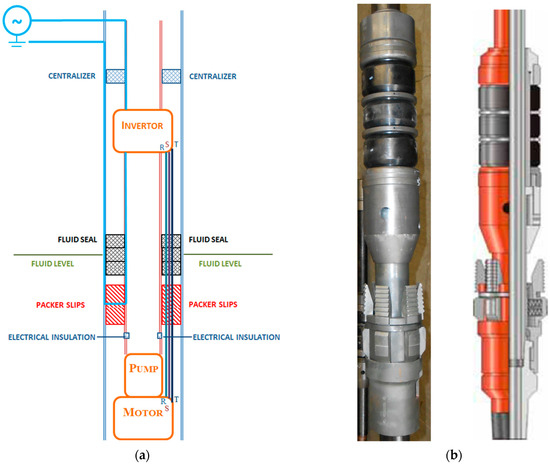 System for high power transmission through well piping: (a) conceptual diagram; (b) existing packer—photo and diagram.