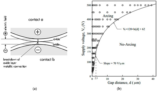 Hence, it is seen in Figure 2b that at small gap distances, the arcing phenomenon is dominated by the gap distance, while it is significantly influenced by the supply voltage at the bigger gap distance. Air breakdown occurs at 70 V/µm up to 175 V, at 10 µm it occurs at 330 V, and at 40 µm it occurs at 500 V.