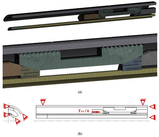 The applied boundary conditions correspond to conditions under the maximal axial force. It was assumed that FAX = 31,138 N (approx. 7000 lbs), based on the set-down weight specified for typical packers of size 45. One-sixth of this value was applied, according to Figure 9b, because of model cyclic geometry. Symmetry is presented by tangential constraints. Radial displacement is constrained over the external casing diameter. Axial displacement is constrained on the end side, representing the full axial attachment of the packer to the casing.