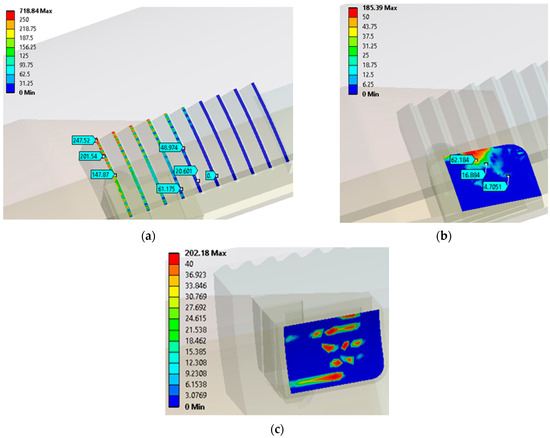 The first important parameter is the contact pressure. Its distributions for three contacts (as mentioned above) are shown in Figure 10 (using different scales for better presentation of the proper results and better understanding the values). The slip-to-casing contact provides important information about the contact pressure’s unequal distribution. It can be observed that the end teeth bear the load, while the central ones are not in contact at all. This also resulted in high pressure values, reaching about 250 MPa. Some nodal values were higher, but these were due mainly to the mesh size and local effects. The main conclusion is that more even contact pressure distribution is needed.