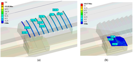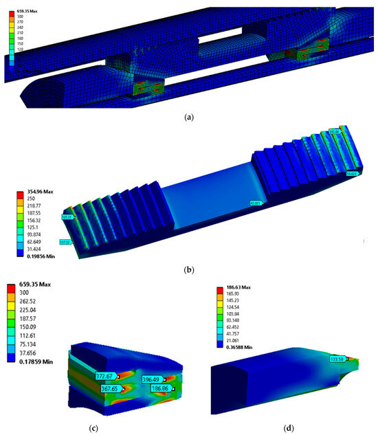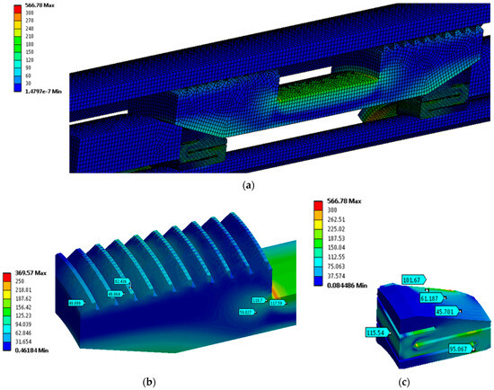 The other important parameter is the distribution and values of the equivalent (von Mises) stress. These are presented in Figure 11, where the overall view is shown for the entire examined model, with a zoomed-in view of the zone of active components. All components’ equivalent (von Mises) stress distributions are shown in detail in the same Figure 11, with particular attention given to the teeth surfaces.