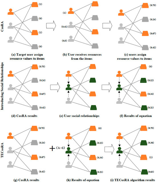 The TECosRA algorithm shares the same first two steps as the CosRA algorithm, but diverges in Step 3; the resources received by an item are divided into two parts, one derived from the CosRA algorithm in Figure 1g, and another redistributed by trusted users as a new resource value , as specified in Equation (4) and illustrated in Figure 1d–f. Ultimately, the item accumulates a combined resource value from both components, as defined by Equation (5) and depicted in Figure 1i. If λ = 0, the TECosRA algorithm degenerates into the CosRA algorithm.