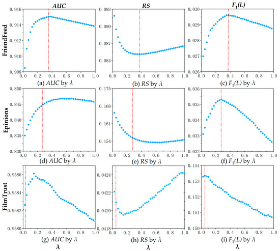 In the recommendation algorithm based on enhanced social relationships proposed in this chapter, a tunable parameter λ is used to adjust the resources received by target users. To explore the effect of the tunable parameter on the performance of the proposed recommendation algorithm, this experiment will increase λ from 0 to 1, and evaluate it on the FriendFeed dataset, Epinions dataset, and FilmTrust dataset through three recommendation algorithm evaluation metrics: AUC, RS, and F1. Figure 2 shows the evaluation results. Figure 2a–i represent FriendFeed, Epinions, and FilmTrust datasets, respectively. Three precision metrics, including AUC, RS, and F1(L), are used on the vertical axis. The adjustable parameter λ increases from 0 to 1 along the horizontal axis. The vertical dashed red line represents the optimal value of the parameter , where the precision metric reaches the optimal value. When calculating the F1(L) measure, L has been established at L = 10. The results were obtained through 10-fold cross-validation and 40 parameter values.