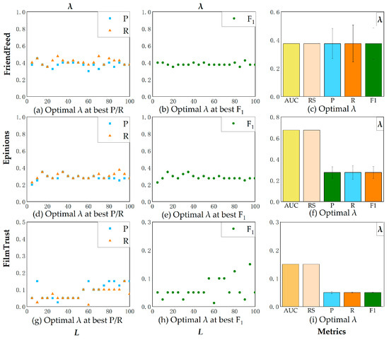 After determining the algorithm’s optimal parameter, subsequent experiments investigated the dependence and sensitivity of the accuracy metrics P, R, and F1 on the recommendation list length L by varying L. In Figure 3a,d,g, the Y-axis is used to represent the accuracy metrics P and R based on L. In Figure 3b,e,h, the Y-axis represents the F1 value. In Figure 3c,f,i, the parameter values λ corresponding to the optimal values for each accuracy metrics are given. The results of P, R, and F1 on both datasets are studied by manipulating the L.