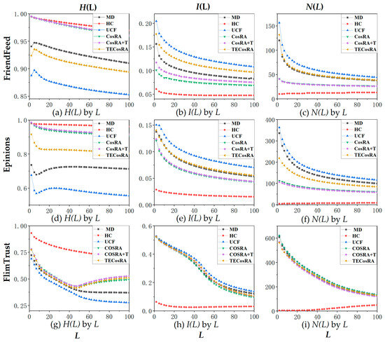 Figure 5 presents the diversity and novelty metrics analysis. Figure 5a–f represent the results on the FriendFeed, Epinions, and FilmTrust datasets, respectively. The L ranges from 1 to 100. The parameter λ of the weighted trust-enhanced recommendation algorithm is set to the ideal value for both datasets. The findings were derived through the application of 10-fold cross-validation. The value of H(L) decreases with the increase in the length of the recommendation list, as shown in Figure 5a,d,g. HC algorithm performs the best. The performance of the new algorithm is close to that of the MD algorithm in terms of H(L), whereas the UCF algorithm exhibits the least favorable performance. The value of I(L) initially experiences a swift escalation and then slowly decreases as the L increases (refer to Figure 5b,e,h). The maximum I(L) value of UCF indicates its worst performance on this evaluation metric. The improved new algorithm performs better than the UCF algorithm and is close in performance to the MD algorithm. The HC algorithm demonstrates superior performance compared to all other methodologies across both datasets, as evidenced by its minimal I(L) value. As for the N(L), the value of N(L) initially decreases rapidly with the increase in the L and then shows a slow decreasing trend (refer to Figure 5c,f,i). After the recommendation list exceeds approximately 50, the algorithm’s results start to become less sensitive to changes in L.