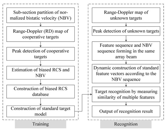 The block diagram of the proposed light-weight RBT method is shown in Figure 1. It consists of the training stage and the recognition stage. Both stages are conducted in the array beam, which is formed using the conventional beamforming technique. During the training stage, the recognizer is trained in a supervised way. We first detect the cooperative targets from the RD map. Then, according to their true bistatic ranges and velocities, we extract their spectrum peaks, from which we estimate the biased RCSs for recognition. At the same time, we also estimate the attitude of targets relative to the receiving station according to the bistatic velocity and the central direction of the corresponding array beam. In this paper, we introduce a parameter, namely, the normalized bistatic velocity (NBV), to approximate the attitude of targets relative to the receiving station. To utilize the local RCS for recognition, the value range of this parameter is divided into several sub-sections. Then, we put the biased RCS into these NBV sub-sections in the target database accordingly. After obtaining all training data, we carry out a statistical analysis of the biased RCSs in each NBV sub-section. The resulting minimum value, mean value, and maximum value of biased RCSs are used to characterize the local scattering characteristics of the standard targets. These features from all NBV sub-sections constitute the model of the standard target of the proposed method.