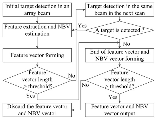 The flow diagram of the proposed method of feature vector construction in our study is shown in Figure 6. It starts when a target is detected in an array beam. Under such circumstances, we extract the biased RCS and NBV from the peak in the RD map using the method introduced in Section 2.2. Then, we move to the next scan of data to check whether or not there is still a target in the same beam. We continue to construct a feature vector with the newly extracted biased RCS and NBV from the newly detected peak until there are no targets detected in the new data or the length of the feature vector reaches the threshold. Then, the feature vector is output for further processing when its length satisfies the threshold. It is worth mentioning that under the assumption of sparse targets in the detection scenario, it is reasonable to assume that an array beam contains only one target. Under such circumstances, the strongest peak is considered the target in case of multiple detected peaks induced by false alarms.
