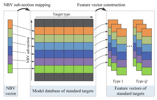 In this section, we realize target recognition by measuring similarity between feature vectors of the unknown target and standard targets. Unlike conventional pre-trained recognition methods, the standard target model, i.e., the standard feature vector, used in our study, is dynamically constructed according to the NBV vector estimated from the unknown target. As shown in Figure 7, we first extract statistical features of standard targets from the target model database to construct standard feature vectors according to the NBV vector of the unknown target. Since the values in the NBV vector indicate the NBV sub-sections corresponding to the biased RCSs in the feature vector of the unknown target, the constructed standard feature vectors reflect the same local characteristics as those of the unknown target. Then, by arranging these features according to the order of NBV values in the NBV vector, we obtain three feature vectors corresponding to the minimum value, mean value, and maximum value of the biased RCS for each standard target.