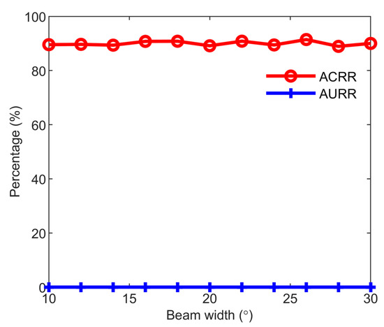 In our method, the array beam is the constraint of constructing feature vectors, and its central direction is used as the approximation of the signal DOA of the target. Thus, beam width is a key parameter that determines the accuracy of feature vector construction and attitude estimation. This section investigates the influence of this parameter on the performance of the proposed method. We conduct a series of recognition experiments by varying the beam width in the range of [10°, 30°] with a step of 2° and calculate the average correct recognition rates (ACRRs) and the average unknown recognition rates (AURRs) correspondingly. The results are shown in Figure 8. It is worth mentioning that the feature vector length used in all recognition experiments is 20.