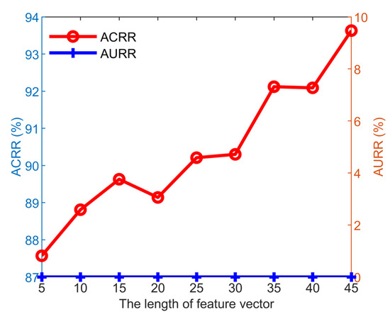 The feature vector is a short time sequence that depicts the trend in the biased RCS of targets varying with the attitude. Its length determines the amount of information to be used for recognition, which is another key factor that determines the performance of the proposed method. In this section, we investigate the influence of this parameter on the ACRR and AURR of the proposed method. The conclusions found in this section will be of great value to the determination of the feature vector length in real-life applications.