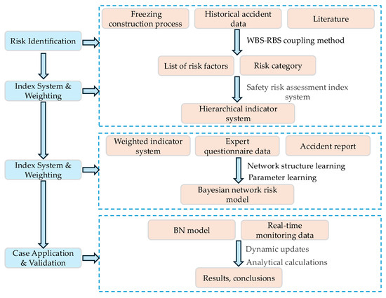 In summary, existing research has employed multiple methodologies—including Bayesian networks, fuzzy comprehensive evaluation, and analytic hierarchy processes—to identify, analyze, and evaluate subway construction risks while proposing response measures. However, these studies often exhibit two main limitations: (1) Conventional static evaluation methods (e.g., FCE and AHP) are limited in capturing dynamic risk evolution, with reported response lags exceeding 48 h in freezing projects [5], necessitating real-time probabilistic modeling. (2) While some research has applied Bayesian networks, a comprehensive dynamic framework integrating real-time monitoring data specifically for the freezing method construction of subway connecting passages remains underdeveloped. To address these gaps, this study conducts a detailed analysis of freezing method construction processes, identifies risk factors through WBS-RBS, determines risk weights through AHP, and constructs a Bayesian theory-based risk assessment model capable of real-time probability updating. The model’s applicability and accuracy are validated through an actual engineering case, ultimately establishing a dynamic risk early-warning framework integrating real-time monitoring data with Bayesian probability updating. The novelty of this research lies in the integration of WBS-RBS with a dynamically updated BN for real-time risk warning in freezing method construction, providing a more quantitative and dynamic approach compared to existing static methods.