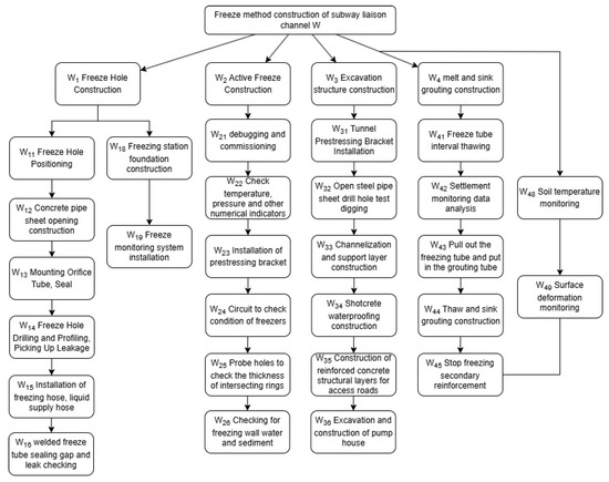 Analyzing the main characteristics of freezing method construction, the freezing method is divided into four main phases: the freezing hole construction phase, the active freezing construction phase, the excavation and construction phase, and the melting and sinking grouting construction phase [9,19,20]. The work decomposition structure for freezing method construction is presented in Figure 2.