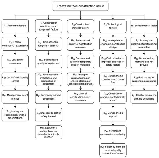 With the acceleration of urbanization in China, underground space development has become an increasingly important approach to addressing urban development challenges [1,2]. This approach not only alleviates resource constraints and traffic congestion but also contributes to sustainable development and the establishment of a resource-efficient society. As of 30 June 2024, 58 cities in mainland China had operational urban rail transit lines totaling 11,409.79 km. During the first half of 2023, 194.06 km of new lines were commissioned, with average daily passenger traffic exceeding 80 million [3]. Tunnel and underground engineering construction frequently encounters complex geological conditions with numerous unpredictable factors [4,5,6]. Water-rich weak strata, characterized by high water tables, elevated moisture content, and low strength, significantly increase construction difficulty and risk [7]. Consequently, artificial ground freezing technology—with its dual functionality of waterproofing and reinforcement—has emerged as a critical solution [8] and is widely employed in urban railway connecting corridor construction. Nevertheless, this method still presents risks, including groundwater inrushes, frozen wall imperfections, tunnel stability issues, and freeze–thaw effects [9]. Therefore, identifying and managing risks during freezing method construction for urban subways and their connecting passages has become paramount to ensure the successful execution of subway projects.
