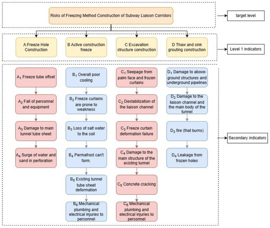 Based on the above WBS-RBS-based combination of methods for the identification of risk factors for the construction of the freezing method of the contact channel, the main influencing factors are classified, screened, summarized, and analyzed in terms of cause and effect, and the index system for the safety risk assessment of the construction of the freezing method of the subway contact channel has been established, which is shown in Table 2, consisting of a total of 20 indexes, with a hierarchical structure as shown in Figure 4.