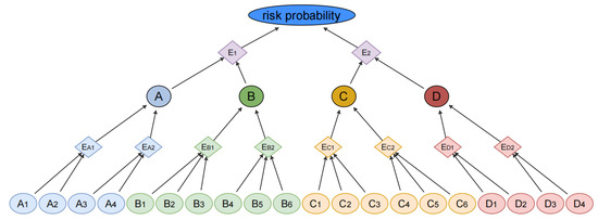Constructing the risk network topology diagram of the contact channel freezing method and the risk network topology diagram of each construction stage from the cause and effect relationship, the initial Bayesian network structure established by the freezing method construction risk system is divided into four layers, and the whole of it is a directed acyclic graph with 59 risk factors as the root nodes, 20 risk categories and 4 risk groups as the intermediate sub-nodes in order, and the comprehensive dynamic risk of the project as the target node, characterized by the ability to The hierarchical distribution and logical relationship of each risk indicator is visualized in the form of a directed acyclic graph. The structure of the Bayesian network is shown in Figure 5, which provides a simplified conceptual illustration of the BN architecture for one risk category. The detailed full network models are provided in Appendix A figures for reference.