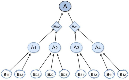 In the above table, aij denotes the weighting coefficient of the corresponding state of the ith parent node under scenario j. Since all the nodes in the network have only two states, their values can be set to 0 (no) and 1 (yes). b denotes the score of the corresponding child node under scenario j, which is calculated as shown in Equation (1). Finally, P denotes the probability that a child node’s state is “yes” under scenario j, which is calculated as shown in the following Equation (2):