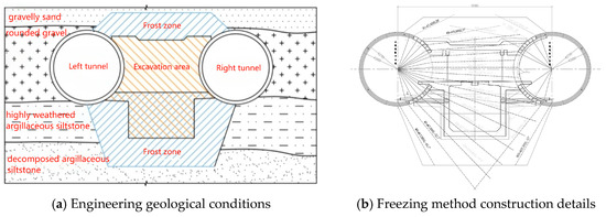 This paper relies on the Nanchang Metro Line 2 Hu Fang Station—Nanchang East Station interval, tunnel length of 834 m. Therefore, according to the specification, in the interval, need to establish a contact channel used to connect the tunnel, drainage, personnel evacuation, and the role of fire lamps, using the freezing method plus the concealed excavation method of construction technology, as shown in Figure 8.