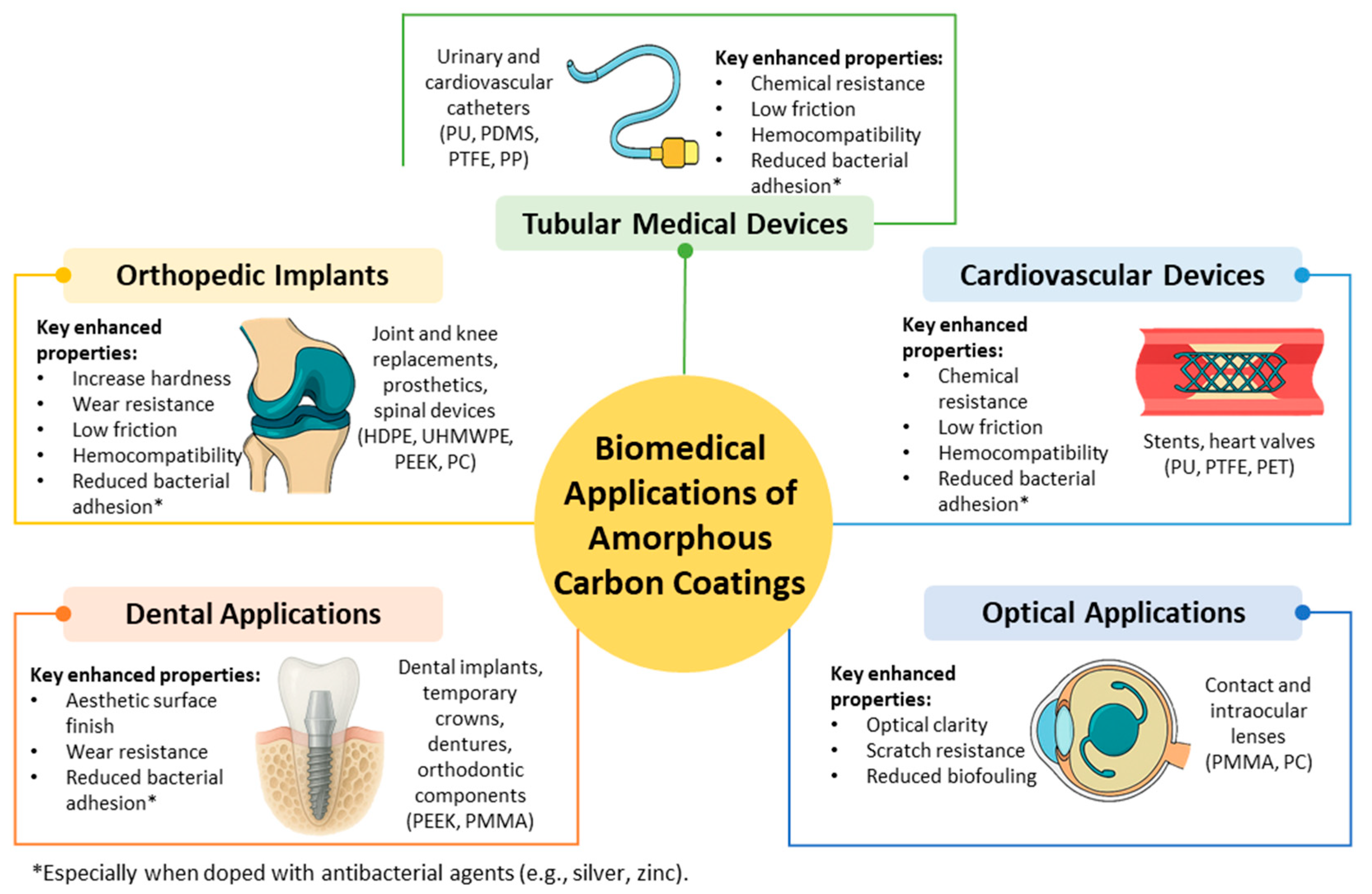 - Peng, Y.; Peng, J.; Wang, Z.; Xiao, Y.; Qiu, X. Diamond-like Carbon Coatings in the Biomedical Field: Properties, Applications and Future Development. Coatings 2022, 12, 1088. [Google Scholar] [CrossRef]