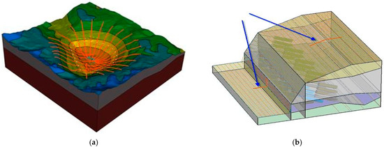 Multi-plane analysis (MPA) and the Entry and Exit method in 3D LEM analysis. (a) Multi-plane analysis; (b) Entry and Exit method (Blue arrows indicate the entry and exit line of the slope profile).