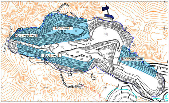 Design drawing of the open-pit mine with four final walls (The blue-colored sections indicate the studied mining wall assessment).