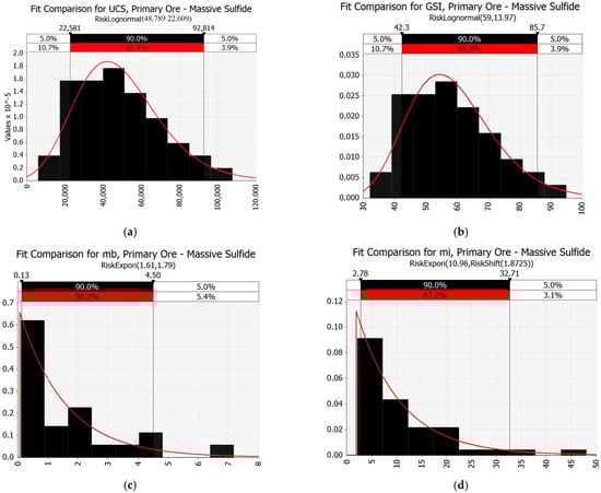 Fitted distributions of primary ore—massive sulfide. (a) Lognormal distribution of UCS; (b) lognormal distribution of GSI; (c) exponential distribution of mb (reduced value); (d) exponential distribution of mi (material constant).