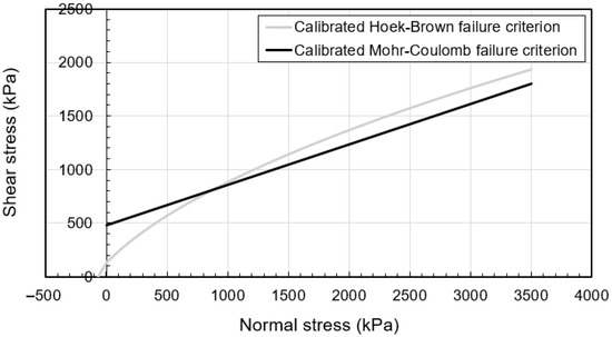 For the EMC criterion, Rocscience Inc, RSData software was used to determine fitted Mohr–Coulomb values, namely the friction angle and cohesion. An important feature of RSData includes the capability to calculate EMC parameters for non-linear failure envelopes. The EMC parameters are automatically calculated with GHB non-linear strength criterion RSData [23]. Mohr–Coulomb parameters are calculated by determining a linear envelope that provides a “best-fit” over a given stress range of a non-linear envelope using [24]. Figure 7 presents the fitted EMC and GHB model stresses in both the principal stress plane and normal/shear stress plane. As shown in Figure 7, the deterministic rock mass strength parameters corresponding to the EMC linear failure criterion are a cohesion of 488.89 kPa and a friction angle of 21.7°.