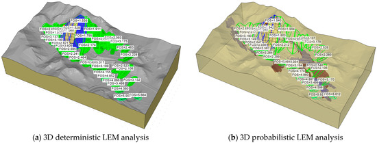 Results of the full 3D LEM model: (a) Deterministic/Homogeneous model/FoS = 1.52–1.66; (b) Probabilistic/Heterogeneous model/mean FoS = 2.54–2.58, PoF = 1.08–1.61%.