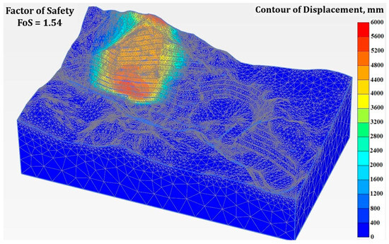 Full 3D FEM model total deformation, (red to orange colors indicate potential failure slip surfaces in the open-pit mine area; FoS = 1.54).