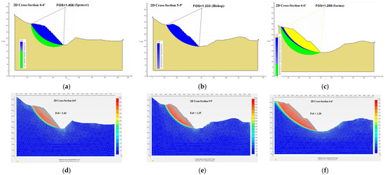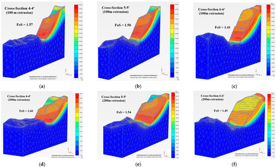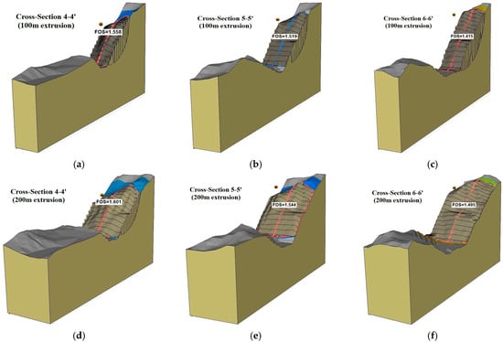 Results of 3D deterministic LEM analysis. (a–c) Show 100 m extrusion models; (d–f) show 200 m extrusion models with critical cross-sections. (a) 4-4′ 100 m model FoS = 1.56; (b) 5-5′ 100 m model FoS = 1.52; (c) 6-6′ 100 m model FoS = 1.42; (d) 4-4′ 200 m model FoS = 1.60; (e) 5-5′ 200 m model FoS = 1.54; and (f) 6-6′ 200 m model FoS = 1.50.