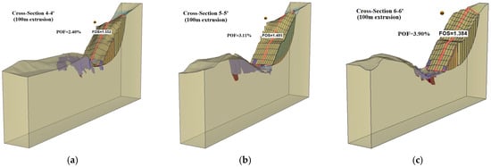 The 3D deterministic FEM analysis followed the same procedure as 3D deterministic LEM analysis. Figure 12 presents the results of the 3D deterministic FEM analysis for three critical cross-sections, comparing two extrusion widths, 100 m and 200 m. In the 100 m extrusion models (Figure 12a–c), the FoS are 1.57, 1.50, and 1.41 for cross-sections 4-4′, 5-5′, and 6-6′, respectively. When the extrusion width is increased to 200 m (Figure 12d,e), the corresponding FoS increases slightly to 1.60, 1.54, and 1.49. The FoS results from 3D LEM and FEM deterministic analyses were similar, with a difference within 0.01.