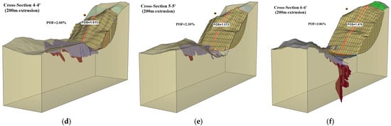 Results of 3D probabilistic LEM analysis. (a–c) Show 100 m extrusion models, (d–f) show 200 m extrusion models with critical cross-sections. (a) 4-4′ 100 m model FoS = 1.55; (b) 5-5′ 100 m model FoS = 1.49; (c) 6-6′ 100 m model FoS = 1.38; (d) 4-4′ 200 m model FoS = 1.62; (e) 5-5′ 200 m model FoS = 1.57; (f) 6-6′ 200 m model FoS = 1.48.