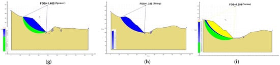 Results of 2D analysis in critical sections. (a–c) Show 2D cross-section deterministic LEM models; (d–f) show 2D cross-section deterministic FEM models; and (h,i) show 2D cross-section probabilistic LEM models. (a) 4-4′ LEM Det. model FOS = 1.41; (b) 5-5′ LEM Det. model FOS = 1.33; (c) 6-6′ LEM Det. model FOS = 1.30; (d) 4-4′ FEM Det. model FoS = 1.43; (e) 5-5′ FEM Det. model FoS = 1.35; (f) 6-6′ FEM Det. model FoS = 1.28; (g) 4-4′ LEM Prob. model FoS = 1.41; (h) 5-5′ LEM Prob. model FoS = 1.33; and (i) 6-6′ LEM Prob. model FoS = 1.30.