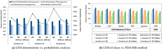 Results of 2D and 3D slope stability analyses: (a) FoS results of LEM deterministic vs. probabilistic analysis in terms of 2D and 3D models; (b) FoS results of LEM of slices vs. FEM-SSR method.